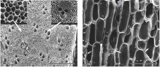 从概念中可以看出,生物炭产品在我们日常生活中并不少见。我们冬季取暖以及野外烧烤所用的木炭、竹炭、机制炭以及工业上常用的活性炭等产品,均属于生物炭的一种,它属于人为通过物理化学方法所制备的富碳产物。 从组成成分上来说,生物炭主要由芳香烃和单质碳或具有类石墨结构的碳组成,一般含有60%以上的C元素,含有的其它元素主要有H、O、N、S以及丰富的矿质元素等。 生物炭长期应用在人们的生产生活中,然而把其应用到农业生产中,则是近年来才得到大家的重视。这一应用的提出源于对亚马逊流域印第安人留下的黑土地的增产效果。 目前科学界普遍认为生物炭在农业上的应用对促进土壤固碳、改善土壤健康、提高作物品质具有重要的意义。 生物炭产品的品质受生物质材料、制备技术等方面的影响。 一般来说,良好的生物炭制品在制备完成后,其在土壤中的应用主要的功能成分由三部分组成:稳定的支架碳、小分子的有机碳以及吸附的丰富矿质元素。 其中,支架碳是生物炭的主体,主要是由单质碳或类似石墨结构的芳香碳组成。 这一部分碳的可溶性极低,溶沸点极高,具有高度羧酸酯化、芳香化结构和脂肪族链状结构,因此使生物炭具备了极强的吸附能力和抗氧化能力。 这一部分碳结构保留了原生物质的细微孔隙结构(如下图所示),具有较大的比表面积,因此具有强烈的吸附性,能够吸附重金属、农残等污染物,从而减少植物对这些污染物的吸收;这些孔隙还能吸附植物一时不能利用的氮素养分,后期再缓慢地释放供给植物,从而提高氮肥的利用率。