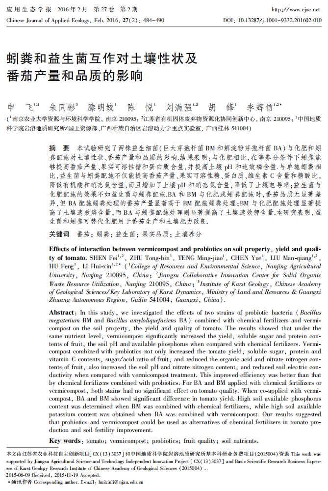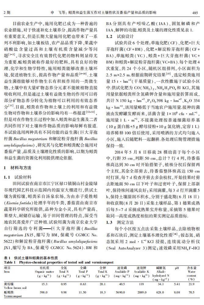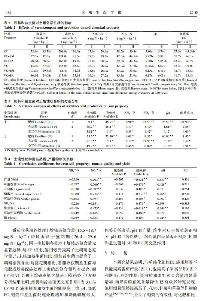 蚯蚓粪和益生菌互作对土壤性状及番茄产量和品质的影响