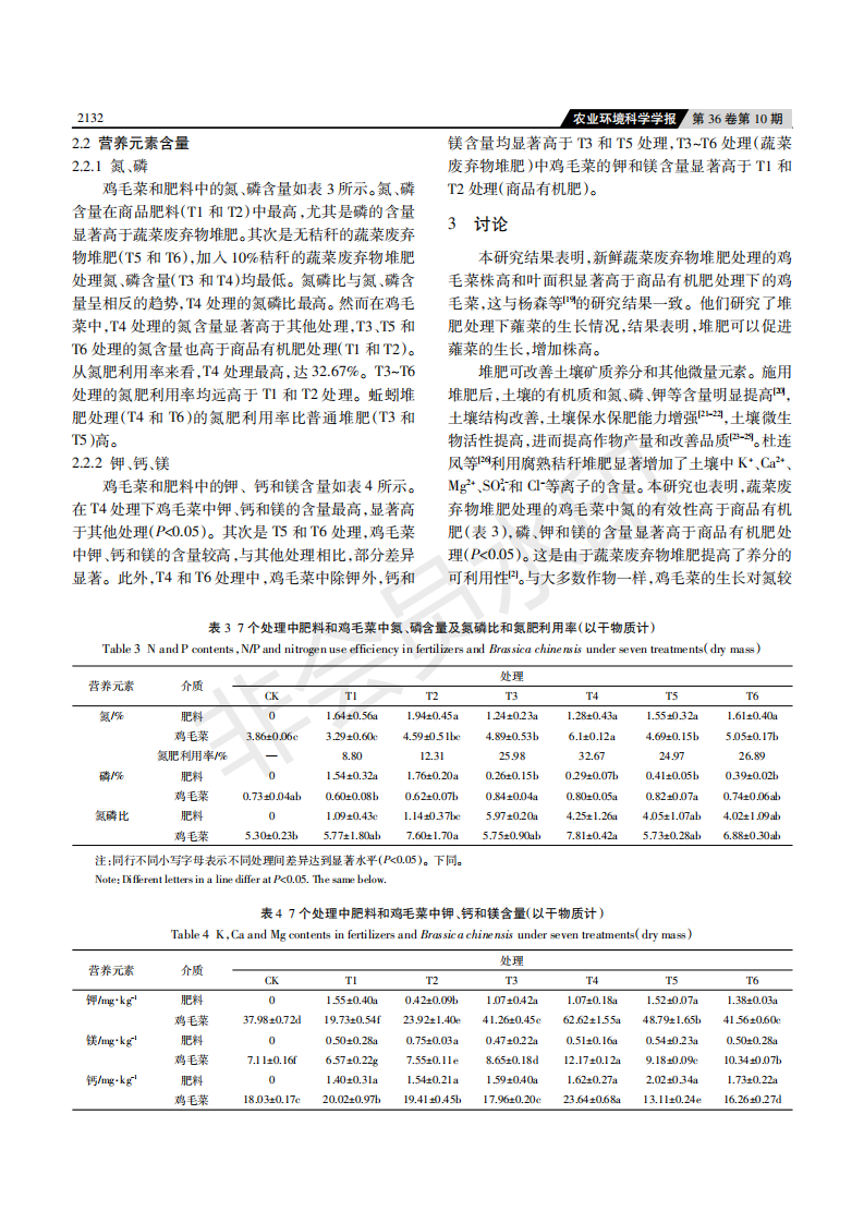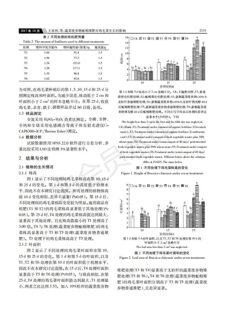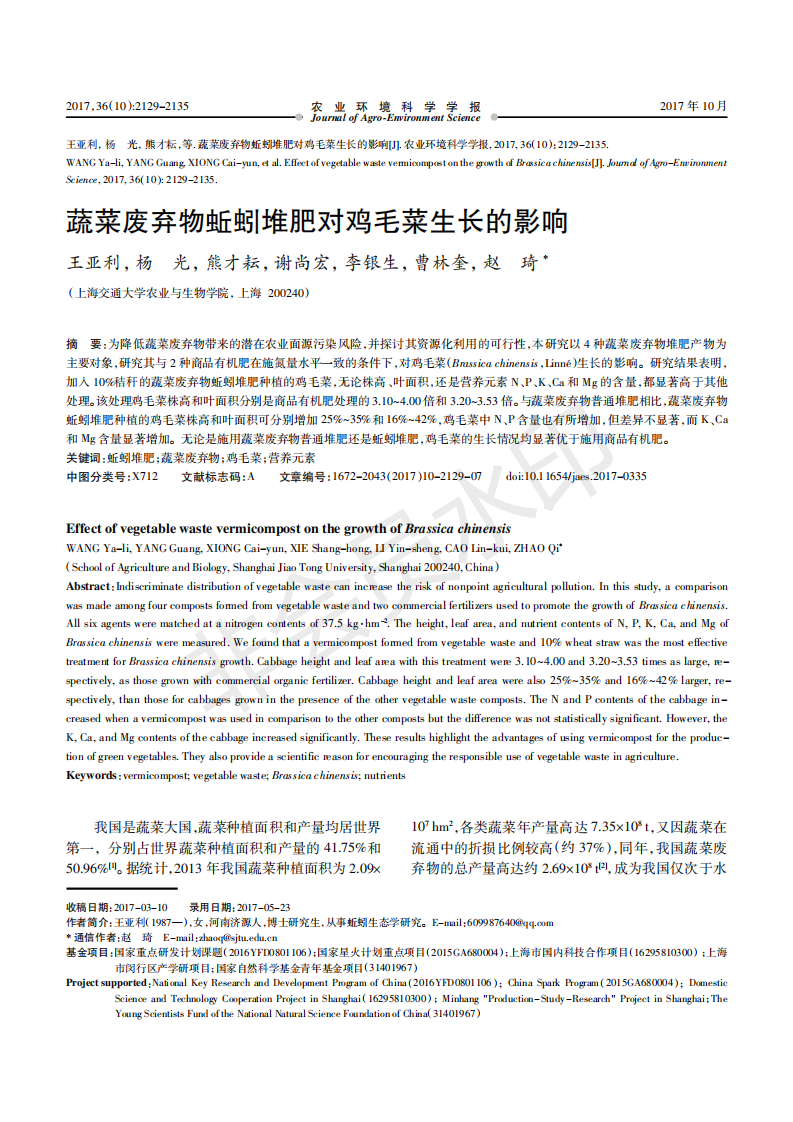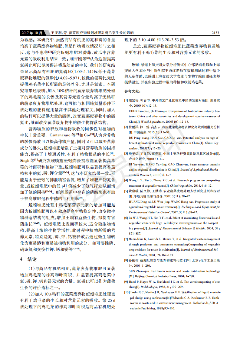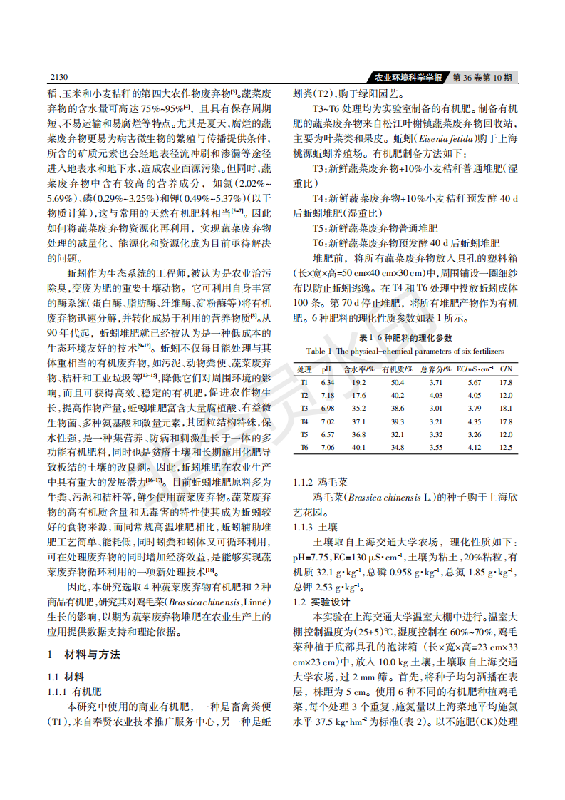 蔬菜废弃物蚯蚓堆肥对鸡毛菜生长的影响