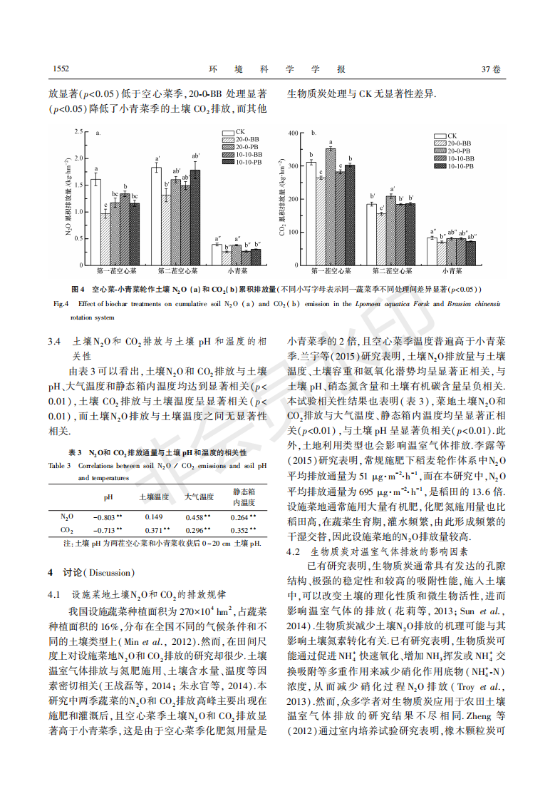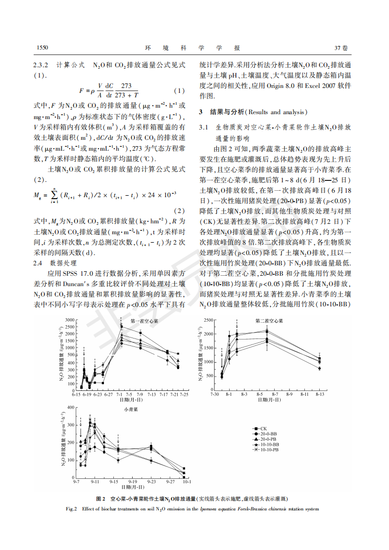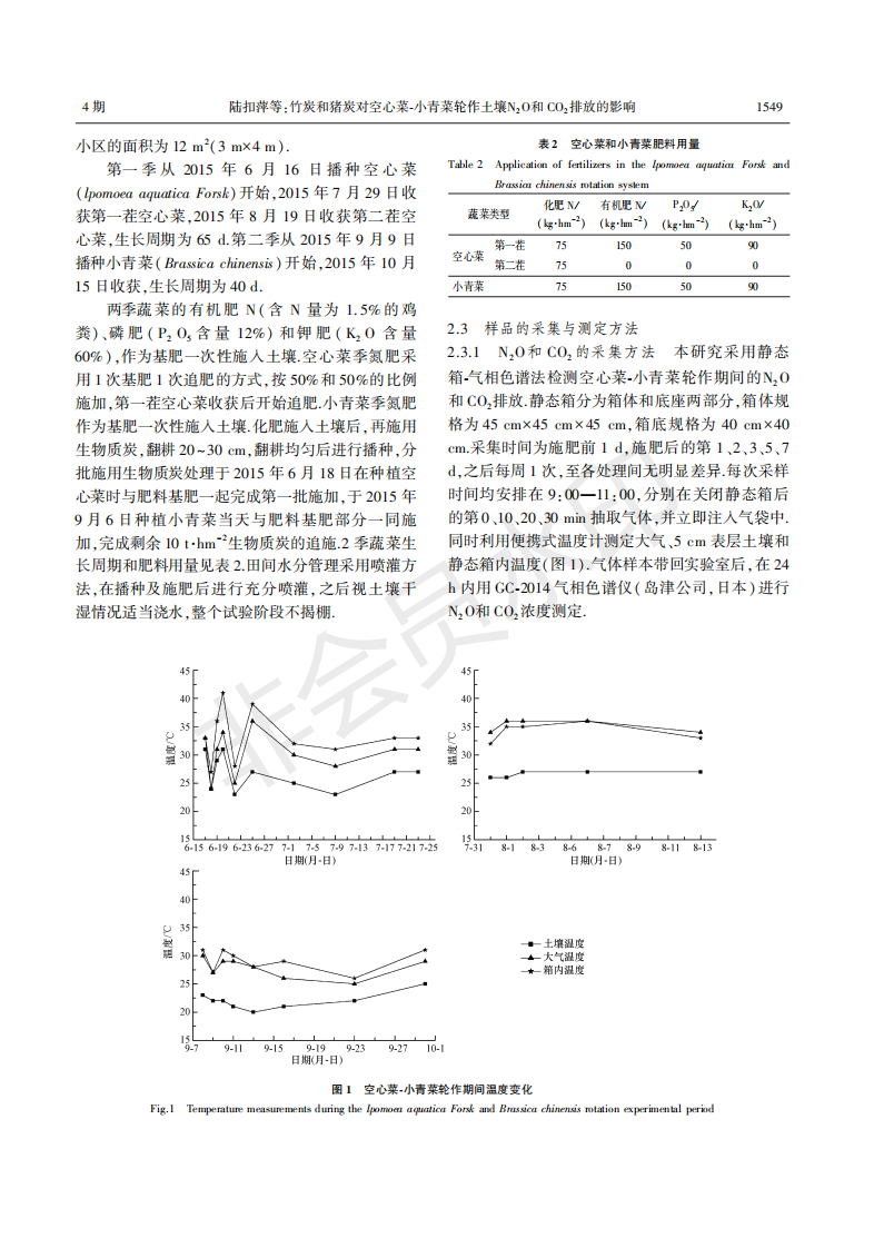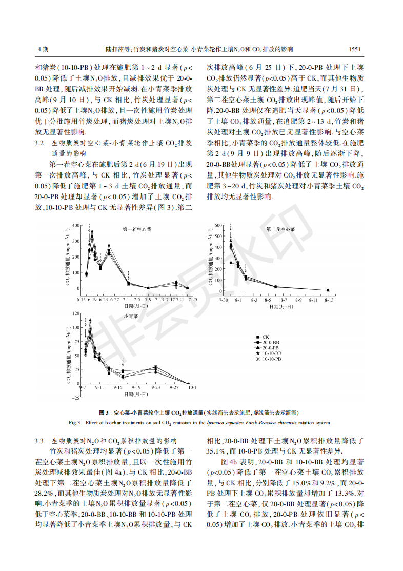 竹炭和猪炭对空心菜-小青菜轮作土壤N2O和二氧化碳排放的影响