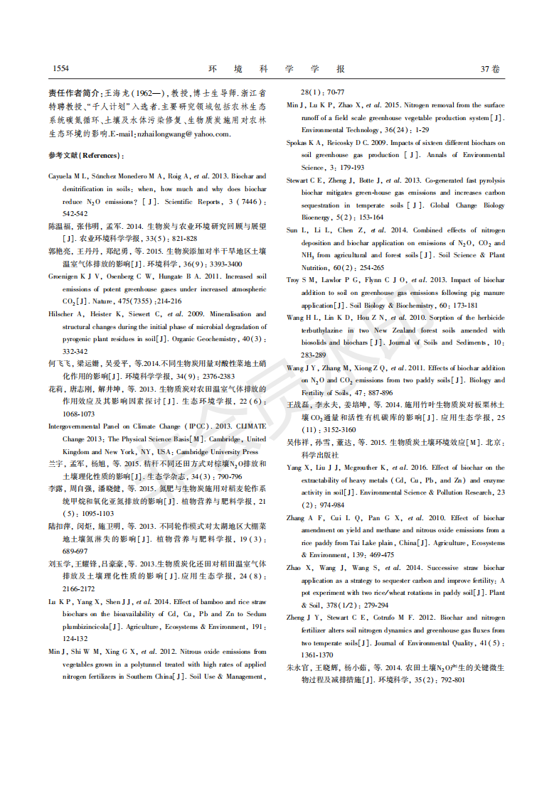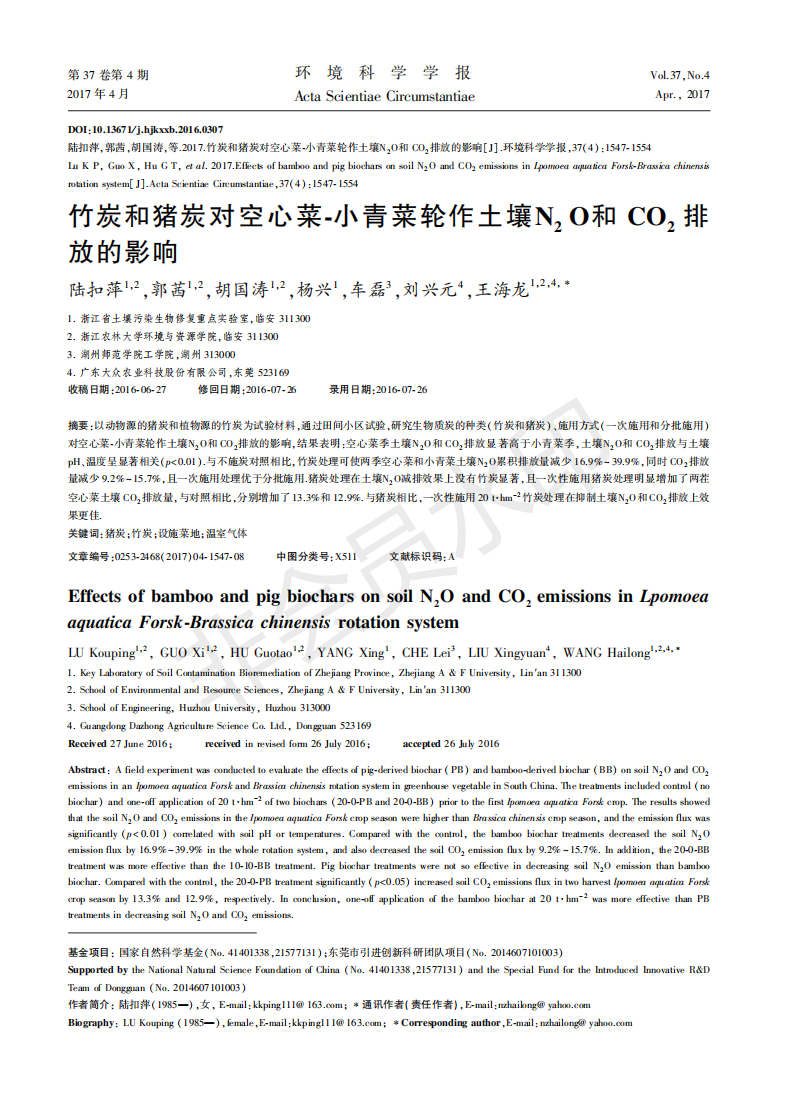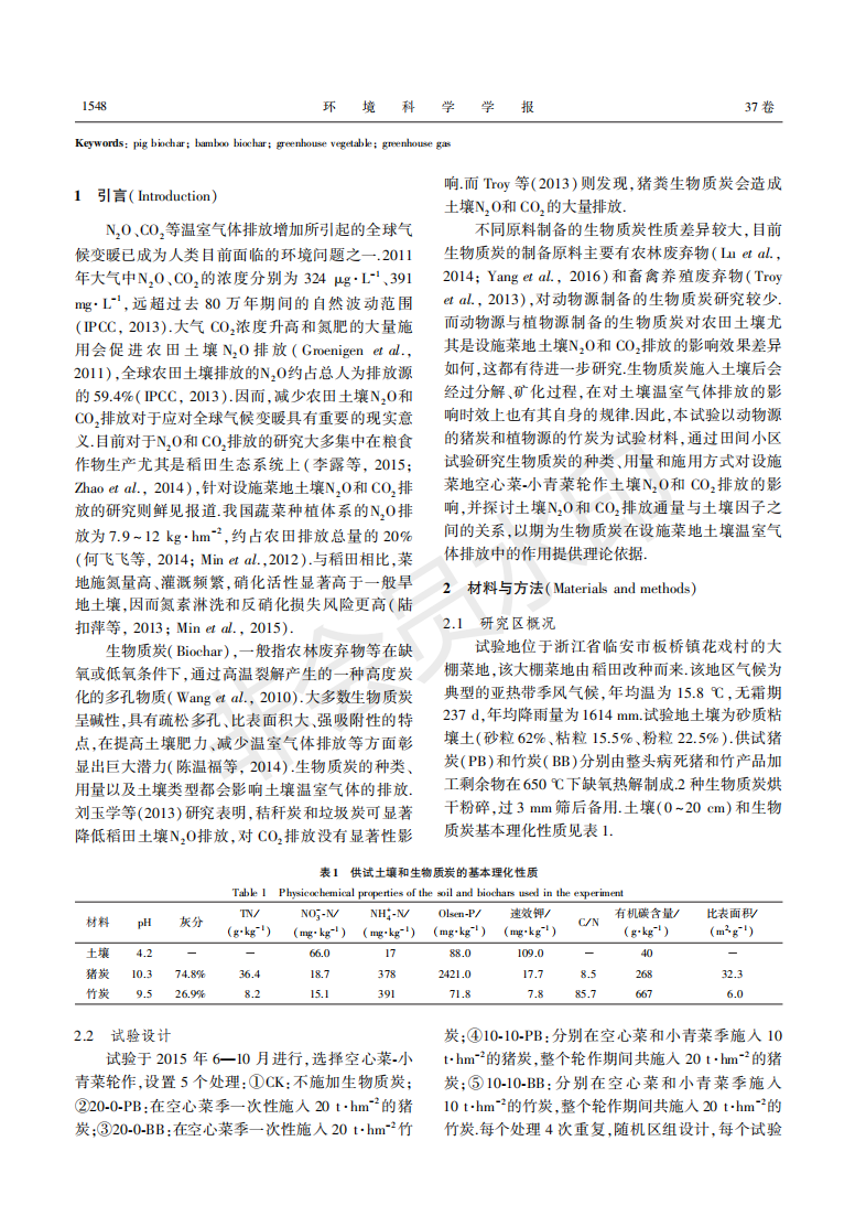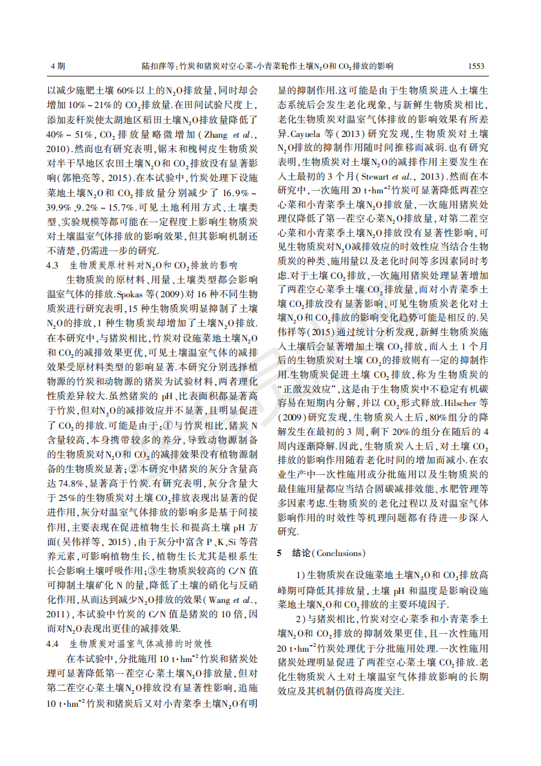 竹炭和猪炭对空心菜-小青菜轮作土壤N2O和二氧化碳排放的影响