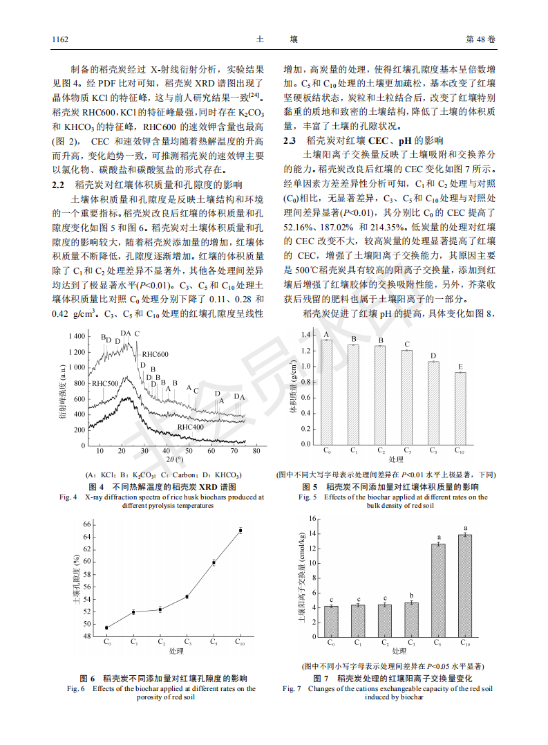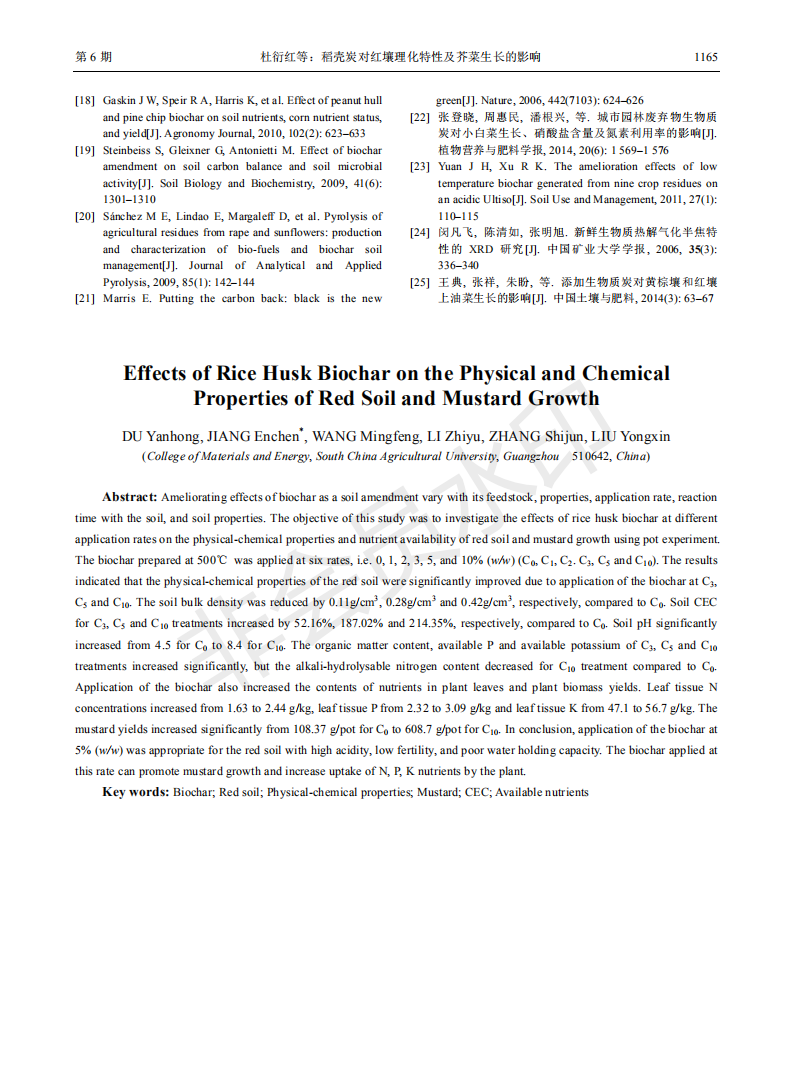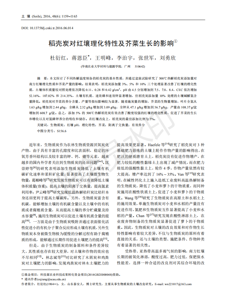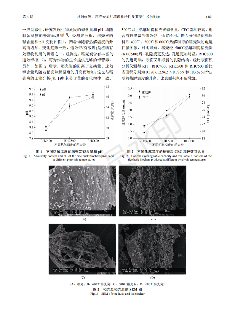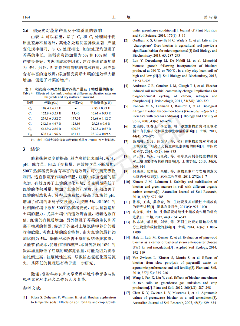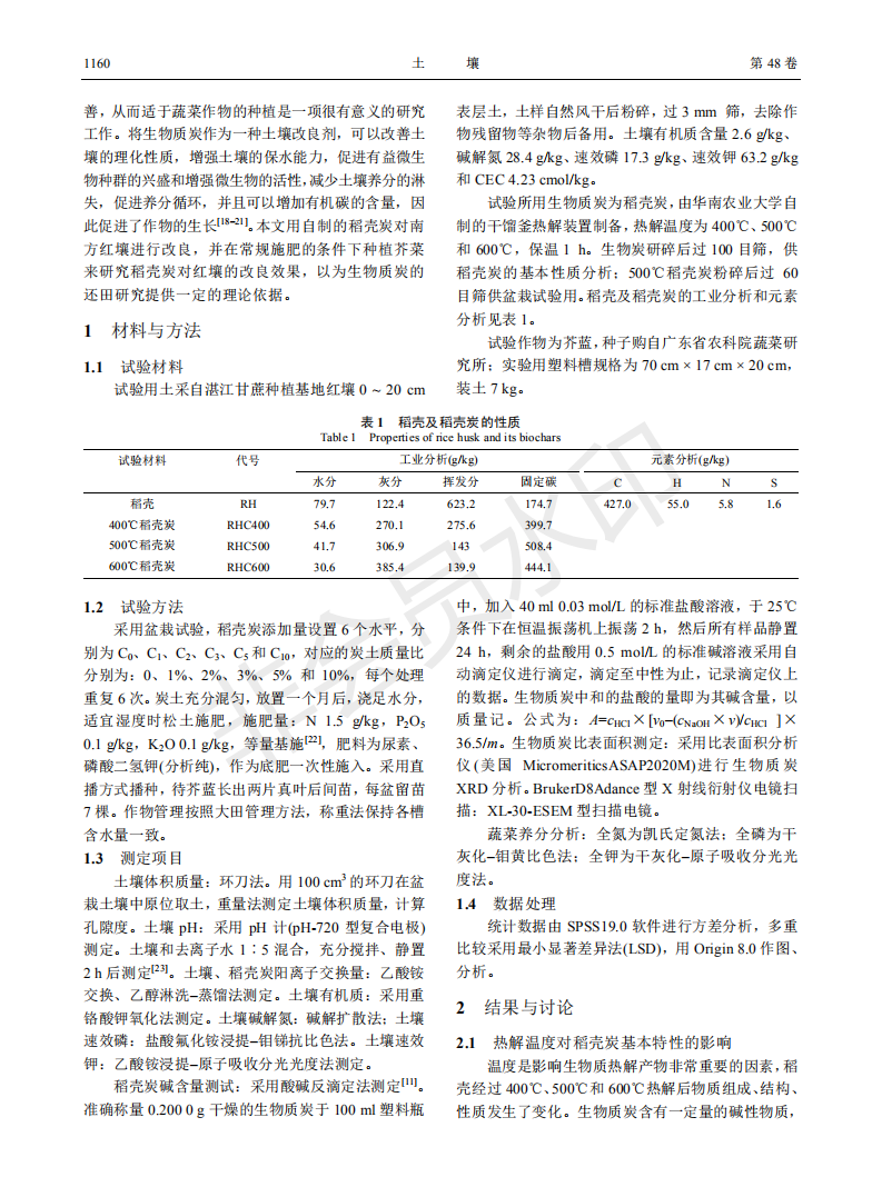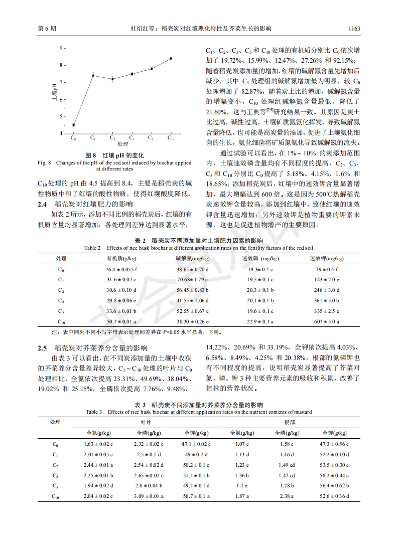 稻壳炭对红壤理化特性及芥菜生长的影响